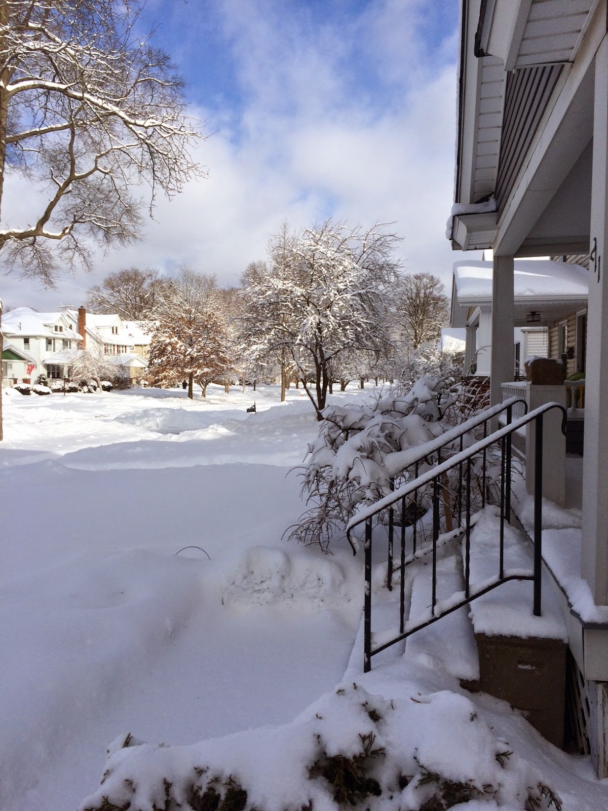 What we've lost in degrees Fahrenheit, we've gained in inches of snow. Yesterday, we leveled off at 32 degrees and picked up over a foot of new snow. It just kept coming and there wasn't a single solitary thing I could do about it. Rick went out twice and threatened it mightily with the snowblower, but it continued on and on and on, well into the night and through the early morning when he left for work at 6:15, shovelling a path to his car. It finally stopped at about noon, but not until it had left us all in a snowy oblivion with temperatures of 17 degrees and winds blasting us from the north.